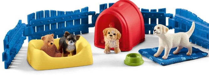 Un Maltipoo, un Chihuahua et un Labrador Retriever jouent ensemble dans l'enclos des chiots. Quelle période folle ils vivent tous les trois ! Ils s'ébattent sur la couverture douillette, rivalisent pour l'ours en peluche et jouent à cache-cache. Entre-temps, ils font une sieste bien méritée dans le panier du chien. Contenu 1x chiot Maltipoo, 1x chiot Chihuahua, 1x chiot Labrador Retriever, 1x niche, 1x panier pour chien, 1x couverture, 1x bol, 1x ours en peluche, 5x clôture