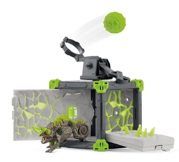 Le caméléon de pierre a agrandi sa BattleCave en une véritable forteresse pour protéger le cristal mondial à l'intérieur des voleurs. Grâce à ses yeux surdimensionnés, il peut voir de loin lorsque des attaquants approchent. Il est temps de mettre en place la catapulte sur le toit et de mettre les munitions. Mieux vaut se mettre à l’abri du gros orbe qui approche ! Le caméléon est un très bon tireur et peut également attacher la catapulte sur le côté de la BattleCave si nécessaire. Les BattleCaves ELDRADOR® CREATURES transforment chaque chambre d'enfant en une zone d'action ! Qui affrontera cette bataille époustouflante ? Toutes les BattleCaves peuvent être combinées. Des tunnels effrayants et des pièges délicats attendent les attaquants. Dans la grande arène, ils pourront alors se retrouver pour le duel final. Quel combat ! Contenu 1x caméléon en pierre, 1x cadre de base BattleCave, 1x pierre de cristal du monde, 1x porte, 3x sol, 1x catapulte, 1x orbe, 1x sol tournant, 5x cristal de pierre, 1x mur tournant en cristal