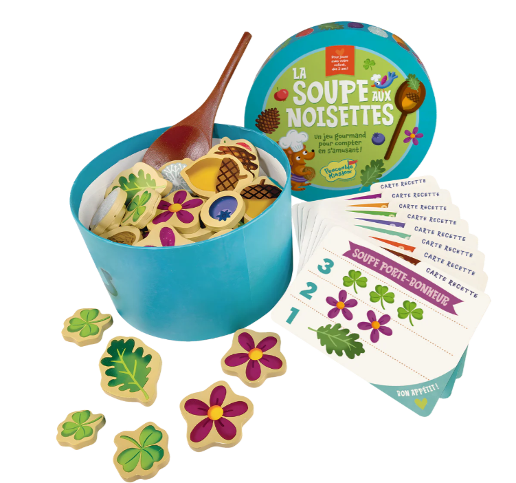 Préparer la soupe aux noisettes est simple comme bonjour ! Le fond rond de la boîte sert de bol, qui contient des ingrédients en bois et une solide cuillère en bois pour mélanger et remuer. Des fiches de recettes simples apprennent aux tout-petits à identifier les ingrédients et à compter pendant qu'ils cuisinent. Mélangez, remuez, mangez et jouez ensemble !